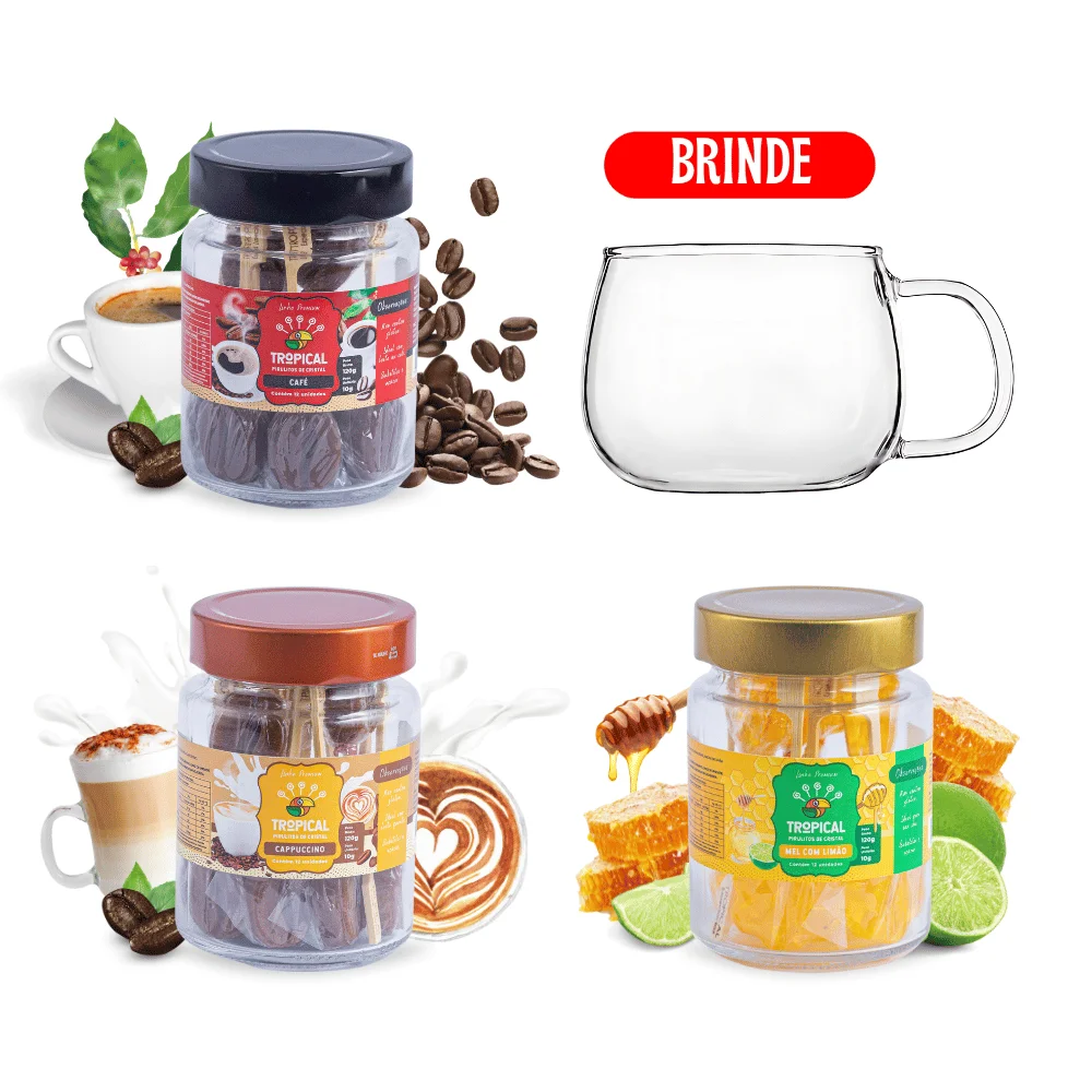 Adicionar ao carrinho [KIT] 3 Potes de Pirulitos de Cristal (Mel com Limão, Café e Cappuccino) + Xícara Elegance 300ml