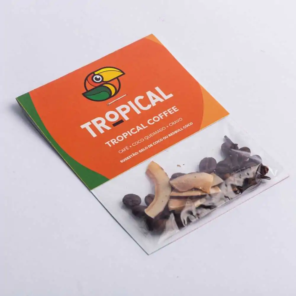 – TROPICAL COFFEE: Café + Coco Queimado + Cravo (Sugestão: Gelo de Água de Coco ou Redbull Coco)