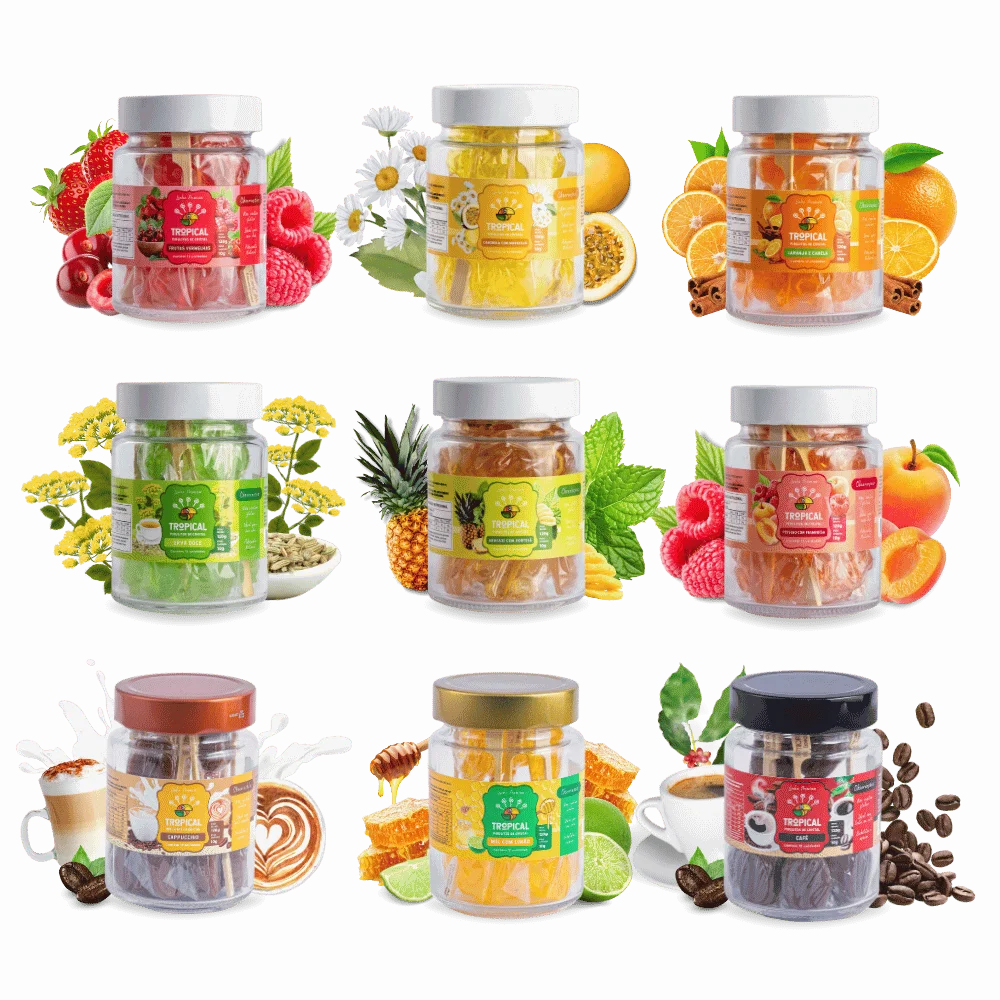 Maracujá, Abacaxi, Café, Camomila, Canela, Cappuccino, Erva Doce, Framboesa, Frutas Vermelhas, Hortelã, Laranja, Limão, Mel, Mel com Limão, Pêssego |