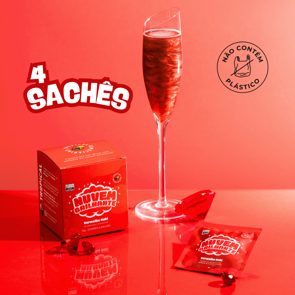 Cada caixa contém 4 sachês, possibilitando a criação de quatro drinks exclusivos com efeito brilhante. Basta adicionar uma Nuvem Brilhante ao seu espumante, água ou coquetel (de preferência uma bebida transparente) e assistir à magia acontecer.